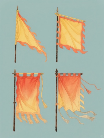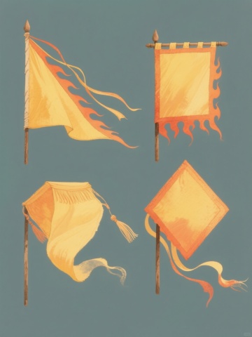 一组6个不同配色、不同造型的旗帜素材集合,保持3D立体风格,规整排布在纯色背景上,每个旗帜都有金色的边框和装饰,顶部有金色的挂饰和红色的流苏,旗帜主体呈现出不同的颜色和独特的金色图案设计,光影效果突出,质感细腻,整体视觉统一且富有层次感