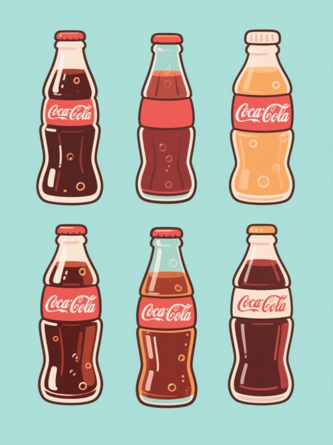 一套六个不同造型的可乐瓶插画集合,保持原图的手绘卡通风格,线条流畅圆润,瓶身有光泽感和气泡细节,采用纯色背景,整体色彩变换为多种不同色调,每个可乐瓶造型各异(如不同角度、不同瓶盖、不同容量或带有简单装饰),所有可乐瓶素材规整排布,呈现出协调统一的视觉效果。