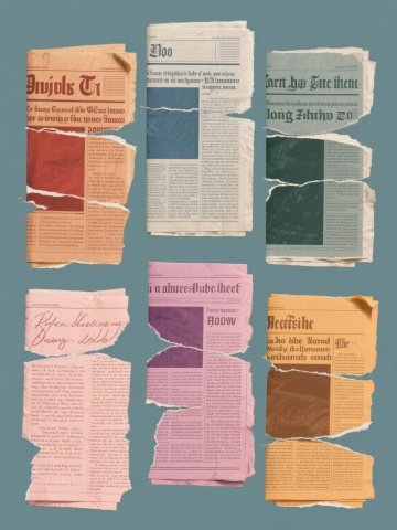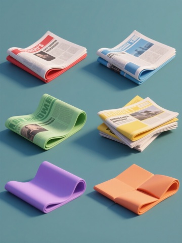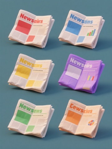 一组6个不同配色、不同造型的3D写实风格报纸素材集合,每个报纸保持折叠或摊开的独特造型,具有清晰的纸张纹理、立体光影效果和细腻的印刷质感,报纸上包含标题文字区域、新闻正文栏和图片图表占位框,整体采用纯色背景,各报纸分别使用红橙渐变、蓝紫渐变、青绿渐变、黄粉渐变、棕灰渐变、黑白对比的配色方案,所有报纸素材规整排布成网格状,呈现出统一的3D设计感和信息图表式的视觉层级。