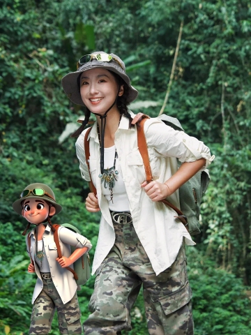 甜美卡通风格,真人与动漫角色同框,展现可爱与梦幻的结合。