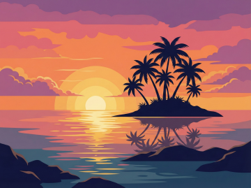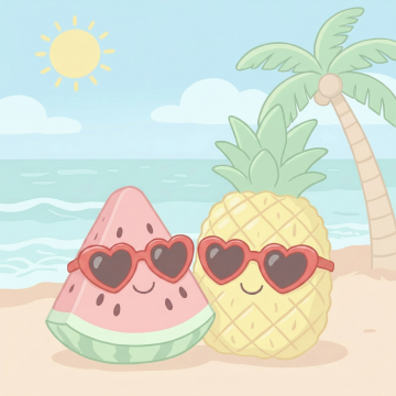扁平化卡通风格插画,两棵椰树并立,左侧椰树树干为浅棕色带环状纹理,树冠是明亮的嫩绿色扇形叶片,右侧椰树树干偏蓝绿色,叶片呈蓝绿色渐变,底部覆盖浅绿色草丛和黄色沙地,整体色彩明快清新,线条简洁流畅,无阴影的平面设计感,充满夏日热带风情。