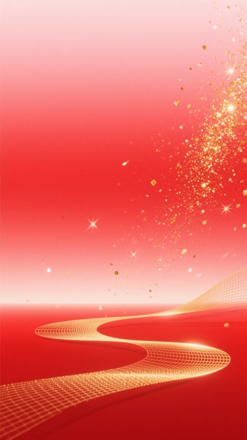 一张具有高级感的红色渐变背景海报,以红色为主色调,从上部的浅粉色逐渐过渡到中部的正红色,再到下部的深红色,色彩和谐且富有层次感。画面中金色的粒子和闪光点缀其中,分布不均,右侧有一片较为密集的金色闪光点,增添了华丽和闪耀的氛围。底部有一条金色的波浪形线条,线条上带有细密的网格纹理,呈现出流畅的曲线形态,从左下角向右上角延伸,动感十足。整体构图采用了视觉引导线,引导观者视线跟随波浪线和闪光流动,光影运用柔和,高光主要集中在金色线条和闪光点上,阴影细节较少,整体呈现出明亮、喜庆且科技感十足的氛围。背景简洁干净,没有多余的元素,信息传达效率高,留白恰到好处,使得主体视觉元素更加突出,具有强烈的现代设计感和节日庆典的感觉。