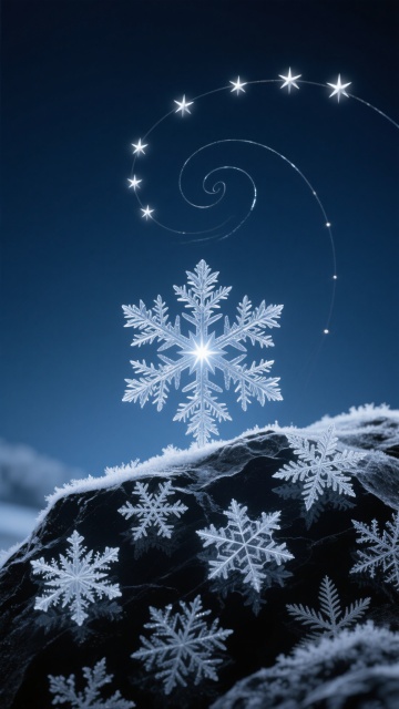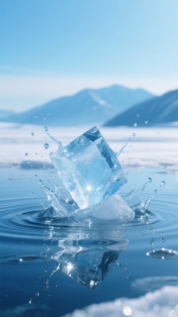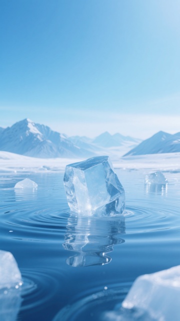 3D渲染风格的冰雪奇幻场景,以纯净的浅蓝色和冰白色为主色调,柔和的漫射光源从上方照射,在冰面上形成淡淡的高光和细腻的阴影,整体呈现出宁静、梦幻而略带清冷的氛围。前景左侧有一块棱角分明的巨大冰柱,表面点缀着少量精致的雪花图案,其晶莹剔透的质感清晰可见。中景是几座形态各异的冰山,其中一座高耸的冰峰占据画面左侧主要位置,冰峰表面有不规则的断裂面和冰棱,折射出微妙的蓝光;右侧远处矗立着一个巨大的冰拱,拱门轮廓平滑,内部透出朦胧的背景,增加了空间的纵深感。冰面并非完全平整,而是有自然的起伏和碎裂的冰块,部分区域融化形成平静的水面,倒映着冰山的轮廓,水面上漂浮着零星的小雪块。整个场景构图遵循三分法,主体冰山位于画面左侧和中央,冰拱作为远景引导视线,留白充足,营造出开阔无垠的冰雪世界感。在保持整体风格和氛围不变的前提下,变换冰峰的具体形状细节,使其轮廓更加尖锐并带有更多垂直冰棱,冰拱边缘增加一些向内凹陷的冰洞纹理,同时在冰面的水面倒影中加入几片缓缓飘落的雪花特写,使画面细节更加丰富多变。