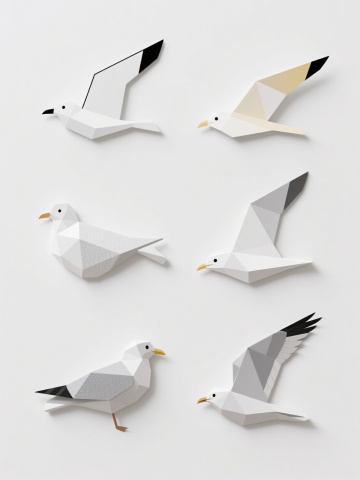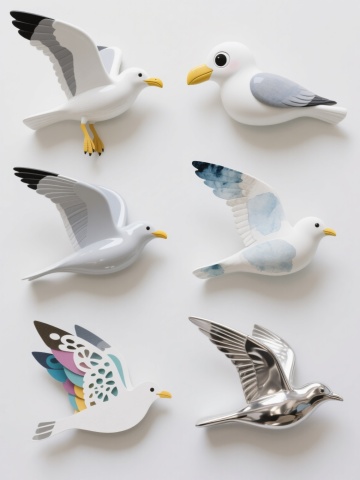 白色背景上,整齐排列着6只不同样式、不同风格、不同材质的海鸥。第一只是写实风格的海鸥,羽毛呈现自然的白色与灰色渐变,翅膀边缘有黑色羽毛,黄色喙部和爪子细节清晰,如同高清摄影;第二只是卡通风格的海鸥,线条圆润,眼睛大而有神,身体呈简洁的白色块状,翅膀和尾巴有夸张的弧度,色彩明快;第三只是3D立体风格的海鸥,表面有光滑的塑料质感,反射着柔和的光泽,翅膀的层次感分明,仿佛是精致的摆件;第四只是水彩风格的海鸥,羽毛边缘有晕染的效果,色彩淡雅通透,白色的身体中透出淡淡的蓝色和灰色,如同水墨画般灵动;第五只是剪纸风格的海鸥,轮廓清晰,由多层彩色纸片叠加而成,翅膀上有镂空的花纹,色彩对比鲜明;第六只是金属质感的海鸥,身体呈现银白色的金属光泽,翅膀和身体有金属的纹理和反光,如同雕塑般具有质感。所有海鸥都保持着飞翔的姿态,翅膀舒展,排列成整齐的队列,整体画面简洁而富有变化。
