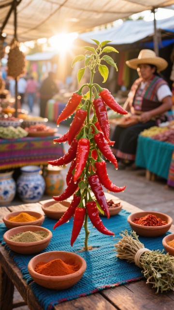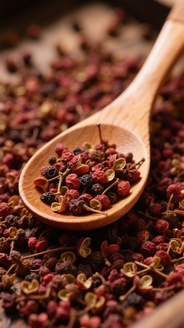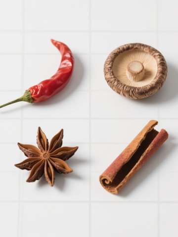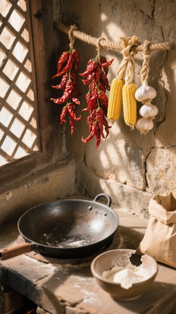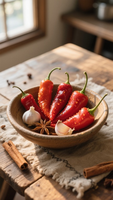 极简构图,留白60%的东方厨房场景,右侧三分之一区域放置一块边缘泛着包浆的老榆木砧板,砧板一角斜倚着半串风干的红辣椒,下方散落三两颗饱满的蒜瓣,左侧远景处虚化的土陶罐中隐约可见褐色的茶叶轮廓,光线以45度角从画面左上方切入,在砧板边缘形成一道金边,投下修长的三角形阴影,深褐色木纹与纯黑背景形成微妙的明暗层次,整体色调为赭石色与墨黑的和谐对话,材质细节保留木材的细小裂纹与辣椒的褶皱肌理,营造出空灵而充满生活温度的禅意氛围。