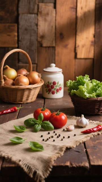 一张具有复古乡村风格的餐桌背景图,画面中心是一块粗糙质感的亚麻色粗麻布餐垫,边缘自然毛躁,随意铺陈在深色木质桌面上,木纹清晰可见。餐垫上散落着几颗红黑相间的胡椒粒和几片翠绿的罗勒叶,增添自然气息。背景中,左侧有一个装满棕色洋葱的浅木色编织篮子,旁边立着一个带有红色浆果花纹的陶瓷储物罐,罐身古朴。右侧是一个装满新鲜绿色生菜的深棕色藤编篮子,底部边缘点缀着一颗鲜红的小番茄、几瓣大蒜和几片罗勒叶,整体色调以棕褐色、原木色、绿色和红色为主,营造出温馨、质朴、充满生活气息的厨房氛围。光线柔和,从上方偏左位置洒落,在餐垫和食材上形成自然的光影过渡,阴影细腻,突出物体的立体感和材质纹理,构图采用近景聚焦餐垫,远景模糊处理背景元素,形成舒适的视觉层次,适合作为餐桌背景使用。