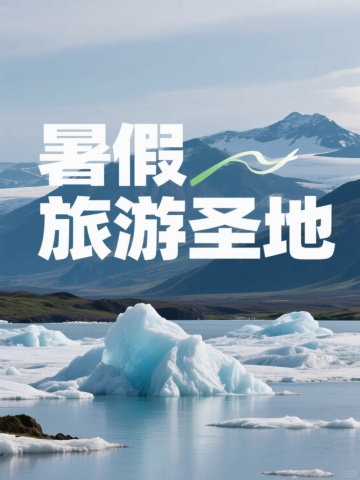 清爽实景风格,大字突出“暑假旅游圣地”,冰川湖景尽显自然之美。