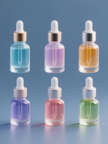 超写实主义风格,六个不同配色、不同样式、不同材质的精华瓶,在纯白色背景上呈整齐排列。每个精华瓶内装有晶莹剔透的液体,带有细腻气泡和流动质感,光影效果突出,高光和阴影过渡自然,展现出玻璃或塑料容器的光滑表面与液体的透明感,整体构图平衡对称,视觉层次分明,突出产品的高端质感与纯净特性。