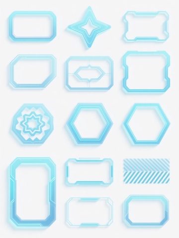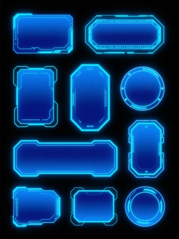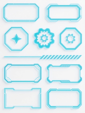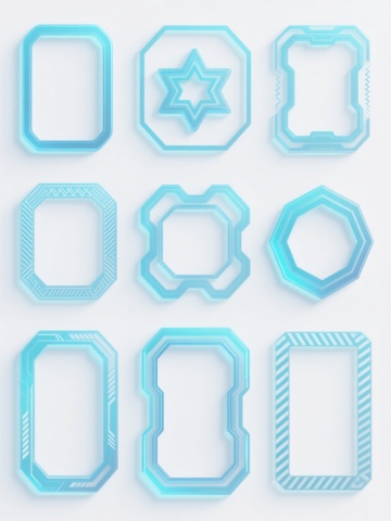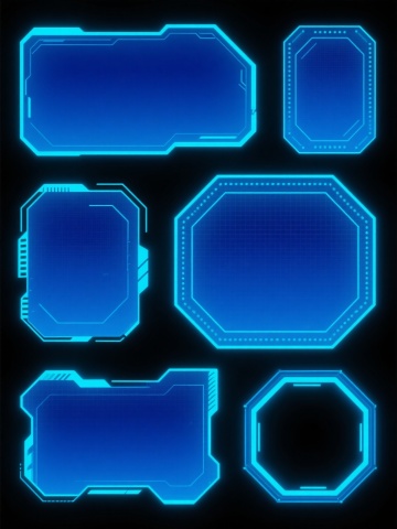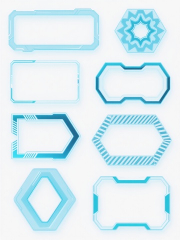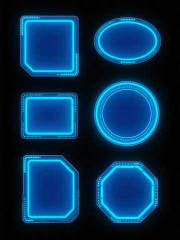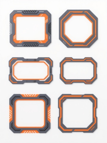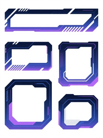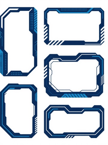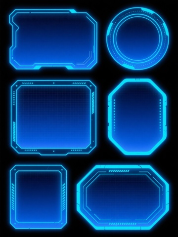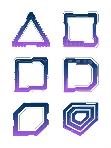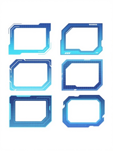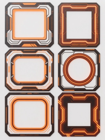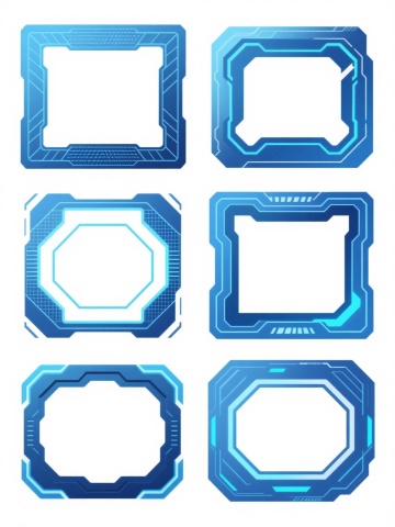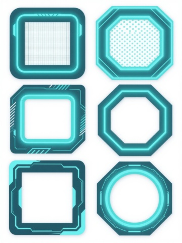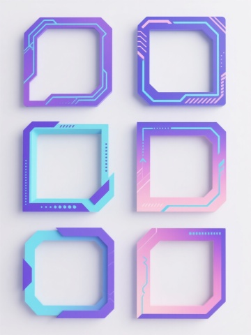 白色背景上,排列整齐的六个不同配色、不同样式的科技边框。这些边框具有赛博朋克风格的设计元素,包括几何形状、线条和装饰性图案。每个边框都有独特的颜色方案和细节设计,如圆形、矩形和不规则形状的组合。整体呈现出未来感和科技感,边框线条流畅,带有发光效果和金属质感,设计简洁而富有层次,适合用于界面元素或装饰性设计。