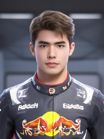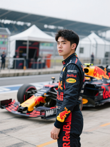 人物穿上赛车服,站在赛道围场,背景是F1赛车 红牛F1