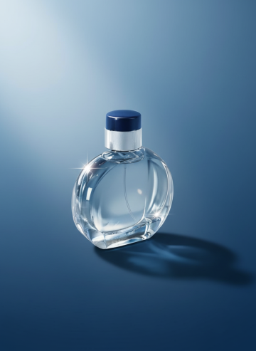 一张高度写实的产品图,主体为一个圆柱形或长方形的透明玻璃容器,容器内装有从顶部深蓝色渐变至底部浅蓝色的液体,液体清澈透明,具有细腻的光泽感。容器顶部配有一个银色的金属瓶盖,瓶盖表面光滑,有轻微的反光效果。整个产品置于纯白色背景上,光线从左上方45度角照射,在容器右侧投射出柔和的阴影,增强立体感。产品边缘锐利清晰,细节丰富,具有高端化妆品的精致质感和专业摄影的商业广告风格。