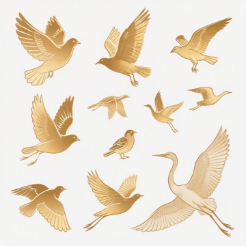一系列6个不同材质和造型的鸽子元素集合,每个鸽子保持飞翔的基本动态但姿态各异,分别采用磨砂玻璃、青铜雕塑、木质拼接、透明水晶、毛绒布艺和陶瓷釉面材质,整体呈现扁平化插画风格,色彩以柔和的蓝灰色调为主,带有渐变光影效果,线条简洁流畅,所有鸽子规整排布在纯色背景上,形成统一且富有变化的系列素材。
