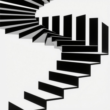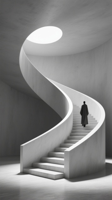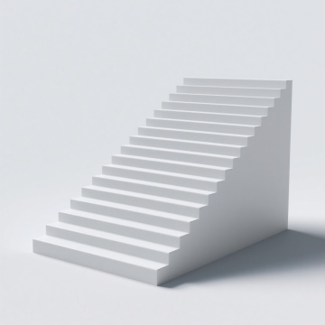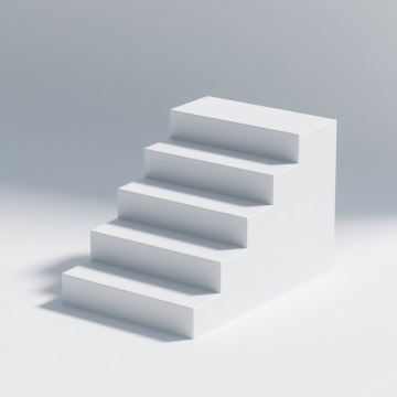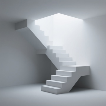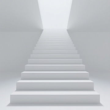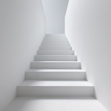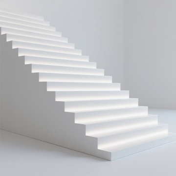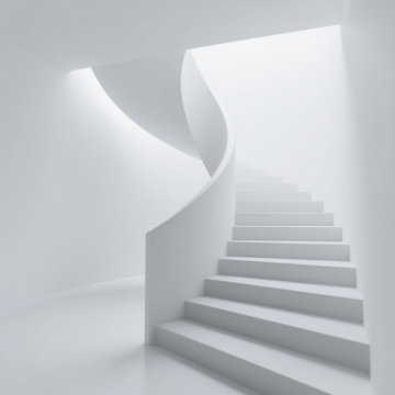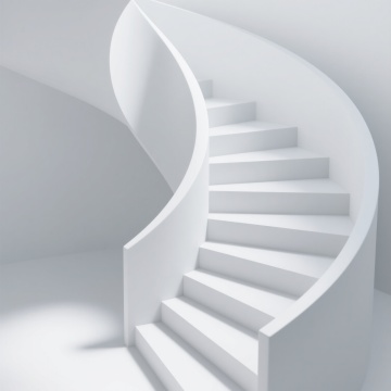 极简主义风格的白色台阶,柔和的米白色背景,顶部斜射的柔和光线形成渐变阴影,光滑细腻的曲面台阶结构,简洁流畅的线条,宁静舒适的氛围,简约现代设计感,突出台阶的立体感和空间层次,无任何文字和装饰元素。