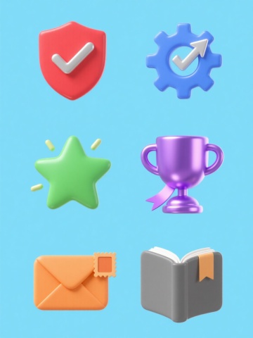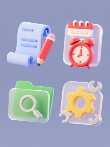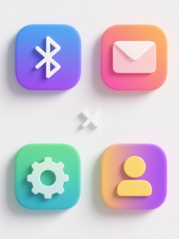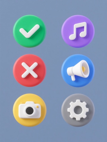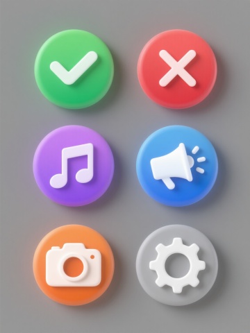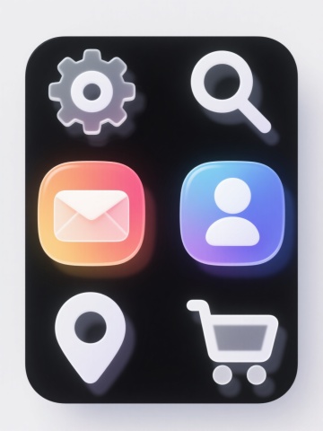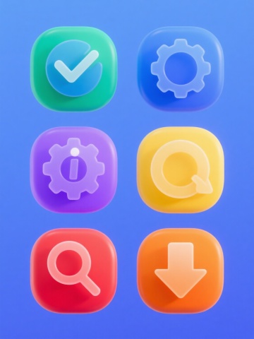 6个不同颜色的3D图标,每个图标都有平滑的渐变和微妙的阴影,呈现出半透明的效果。图标内容分别为:蓝色放大镜和文件、红色齿轮和设置、绿色购物车和商品、黄色信封和邮件、紫色音乐符号和音符、橙色相机和照片。所有图标都放置在纯白色背景上,整齐排列成两行三列的网格布局,每个图标之间有均匀的间距。整体风格保持一致,色彩鲜明,立体感强,具有现代简约的设计感。
