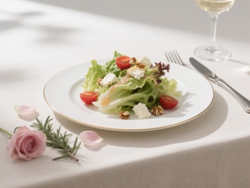 一张精心布置的餐桌,桌上摆放着各种美食,有三文鱼、烤虾、沙拉、蔬菜、水果和饮品等,餐具精致,桌布素雅,旁边有白色的花瓶和盛开的白色花朵,整体呈现出温馨、自然、明亮的居家氛围,光线柔和,色彩清新淡雅,构图饱满,细节丰富,展现出舒适的用餐场景。