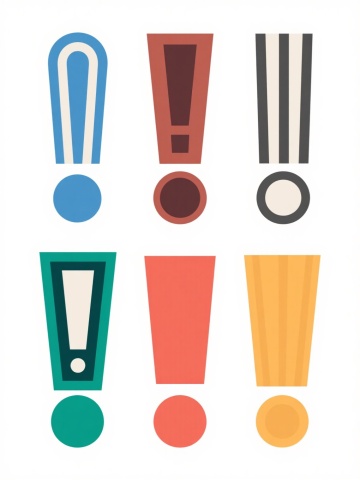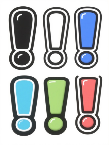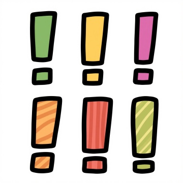一组四个不同元素的图标集合,每个图标都采用与原图相同的简约卡通风格,具有清晰的黑色描边、单一的填充色、平滑的曲线和简洁的几何形状,元素分别为:绿色圆形对勾、蓝色星形、红色感叹号、紫色信息图标,每个图标都有细微的动态线条增强活力感,所有图标整齐排列在纯色背景上,整体色彩明快协调,保持一致的视觉语言和设计感。