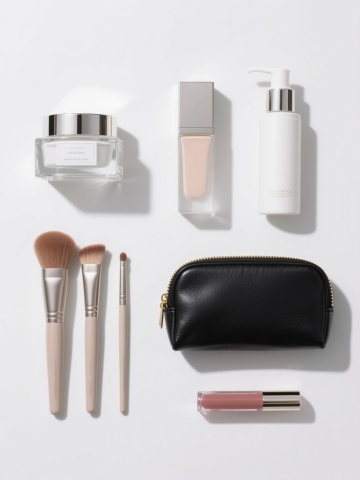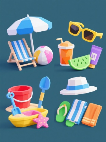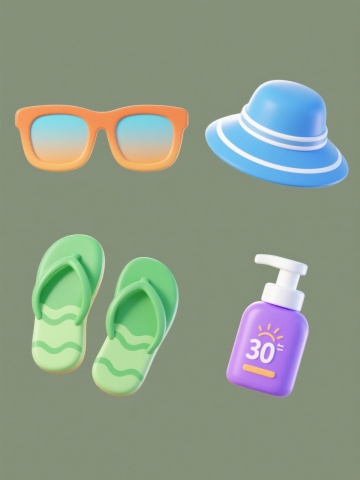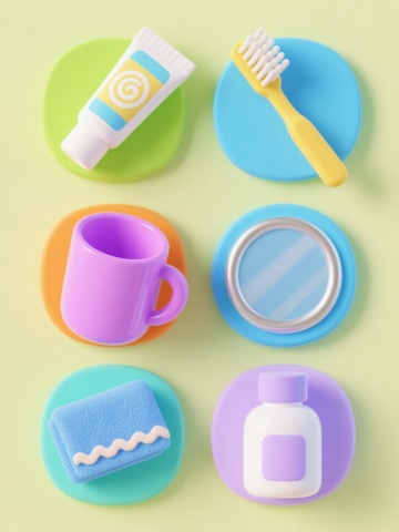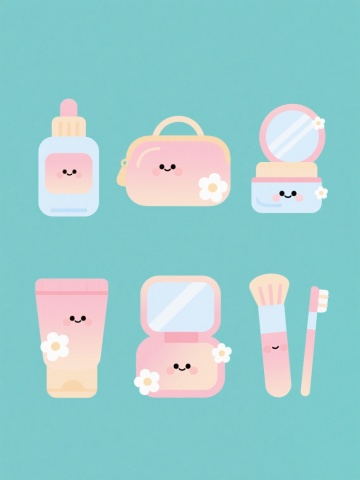 平面插画风格,纯色背景,六个规整排布的美妆元素系列素材集合,每个元素均采用圆润可爱的造型,明亮柔和的色彩搭配,平滑的渐变过渡和简洁的线条勾勒,保持统一的卡通化视觉语言。包含:1.粉色瓶装保湿面霜,带有白色盖子和黄色花朵图案;2.蓝色渐变瓶装爽肤水,搭配银色喷头和水滴装饰;3.绿色管状防晒霜,印有白色SPF50+字样;4.橙色化妆包,带有白色拉链和波点图案;5.紫色睫毛膏,黑色刷头和纤长睫毛图示;6.一套三支不同尺寸的化妆刷,粉色手柄和白色刷毛,整体呈现清新活泼的美妆产品展示效果。