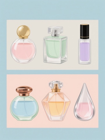 手绘插画风格,纯色背景,六个不同样式的香水系列素材集合规整排布。第一个香水瓶为圆润球形,透明瓶身搭配金色瓶盖,瓶内是淡粉色液体,背景为纯净的浅蓝色;第二个是方形棱角瓶身,磨砂质感,银色瓶盖,瓶内是淡绿色液体,背景为柔和的米色;第三个是细长圆柱形,透明瓶身,黑色瓶盖,瓶内是淡紫色液体,背景为优雅的浅灰色;第四个是不规则几何形瓶身,半透明材质,玫瑰金瓶盖,瓶内是淡黄色液体,背景为温暖的浅橙色;第五个是矮胖圆形瓶身,光滑透明,古铜色瓶盖,瓶内是淡蓝色液体,背景为清新的浅绿色;第六个是水滴形瓶身,晶莹剔透,银色瓶盖,瓶内是淡粉色液体,背景为温柔的浅粉色。每个香水瓶都保留了香水瓶的基本形态和液体、瓶盖等核心元素,通过变换瓶身造型、色彩搭配和背景颜色,形成风格统一又各具特色的系列设计,整体画面简洁明快,视觉层级清晰,信息传达高效。