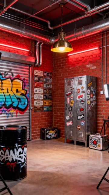 现代工业风餐饮空间,深灰色裸露天花板搭配金属管道与网格装饰,暖黄色吊灯与银色金属灯罩组合提供柔和照明,地面铺设人字形拼接地砖(浅木色与深灰色交错),原木色餐桌搭配灰、白、蓝三色座椅,开放式厨房区域有白色砖墙与红色字体菜单牌,背景墙面挂有黑色 chalkboard 风格的 specials 菜单,整体氛围明亮通透、简约时尚,适合快餐或休闲简餐场景,视觉层次分明,信息传达清晰,符合年轻群体的审美与用餐需求。