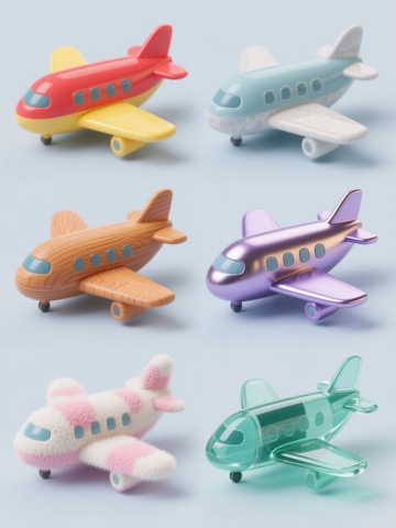 3D卡通风格,六个不同配色、不同材质、不同样式的交通工具元素,排列整齐,白色背景,圆润可爱的造型,鲜艳明亮的色彩,光滑的塑料质感,部分带有透明光泽,每个交通工具都有独特的设计细节,整体呈现出活泼欢快的氛围,具有儿童玩具般的萌系感,光影柔和,边缘清晰,无阴影,简洁干净的视觉效果。