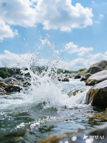 超写实摄影风格,特写镜头下的深色湿岩石被变换的光线照亮,呈现出更加丰富的金色与深蓝反光,水流从岩石边缘奔腾而下,形成更具动感的白色水纹与飞溅的水花,水面波光粼粼,光影交错,整体画面保持深色背景与明亮水流的强烈对比,营造出神秘而富有生命力的自然氛围,岩石表面纹理清晰可见,水珠在岩石上滚动,水流形态流畅自然,光影效果增强立体感与质感。