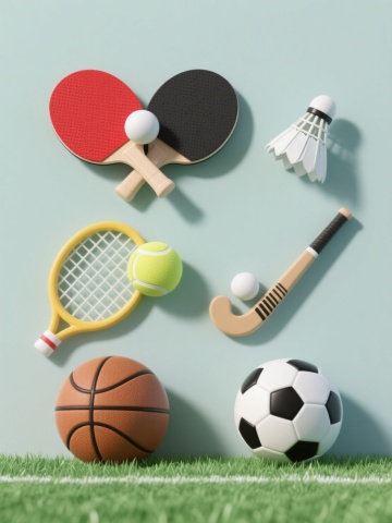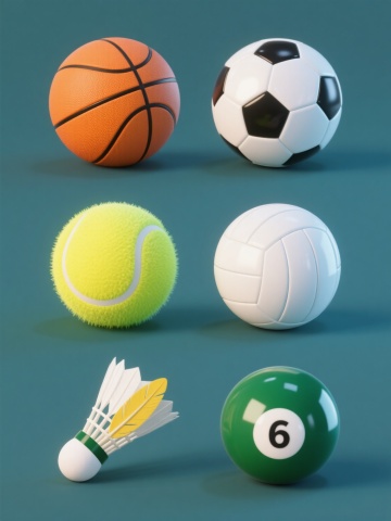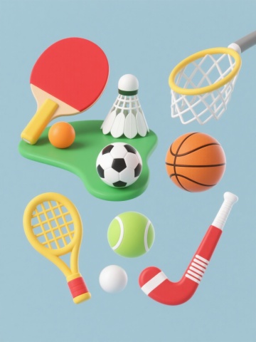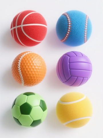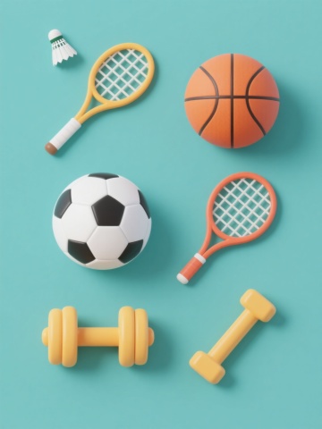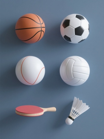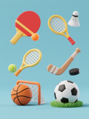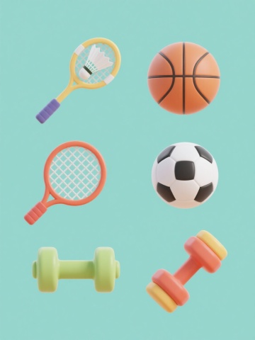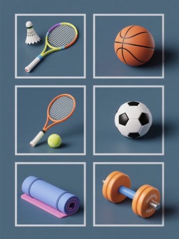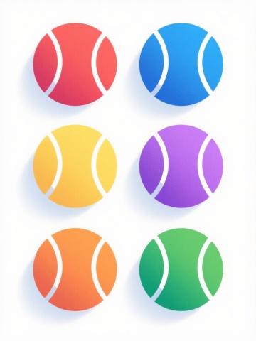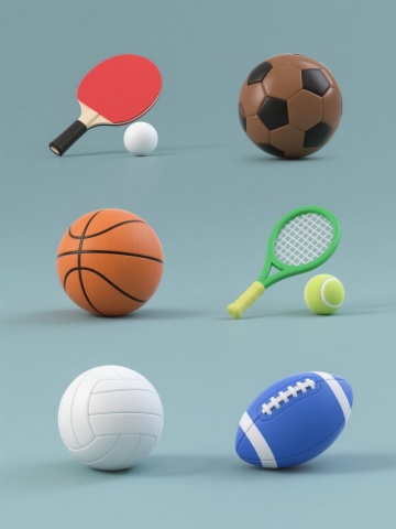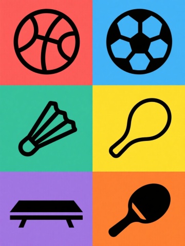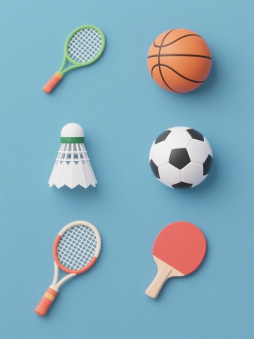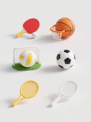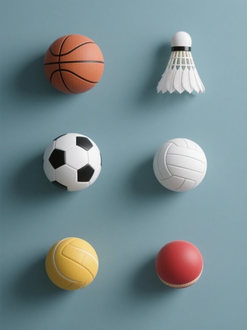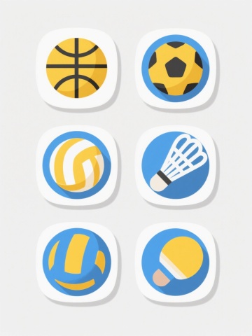 一系列六个完全不同的运动器材图标,每个图标均采用相同的简约扁平风格设计,色彩明快,主色调为黄色、蓝色和白色,轮廓线条平滑圆润,无渐变和立体阴影,保持与单个足球图标一致的视觉语言。图标内容分别为:排球(黄色圆形主体,蓝色波浪纹图案)、羽毛球(白色羽毛环绕黄色圆形球头)、乒乓球拍(蓝色椭圆形拍面,黄色手柄)、篮球(黄色圆形主体,蓝色短线勾勒的接缝纹理)、网球(绿色圆形主体,黄色点状纹理)、橄榄球(黄色椭圆形主体,蓝色斜向条纹)。所有图标规整排布在纯白色背景上,呈两行三列均匀分布,每个图标尺寸一致,间距相等,整体构图平衡对称,具有清晰的视觉层级和高效的信息传达效率,符合现代简约的设计感。
