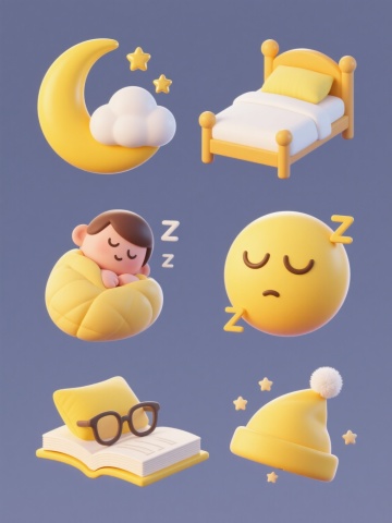 一套6个完全不同元素内容的睡眠主题3D卡通风格系列素材集合,规整排布于纯白色纯色背景上,整体保持圆润可爱的Q版C4D渲染风格,温暖明亮的色彩搭配,柔和均匀的光影效果,细腻光滑的材质表现,每个元素都有俏皮的小细节和精致的高光处理。元素1:一个戴着紫色星星睡帽的小女孩蜷缩在黄色弯月上熟睡,周围环绕着粉色星球和黄色星星;元素2:一只穿着条纹睡衣的卡通小熊抱着枕头躺在云朵形状的床上,床头有小夜灯和故事书;元素3:一个蓝色的睡眠图标,由闭着的眼睛和弯曲的睡眠曲线组成,周围点缀着小星星和Z符号;元素4:一张铺着柔软粉色床单的双人床,床上有两个枕头和一个毛绒玩具,床头柜上有一杯温牛奶和一个闹钟;元素5:一个漂浮的睡眠舱,里面有一个宇航员穿着睡衣在零重力环境下安睡,舱外有星星和行星;元素6:一对穿着睡衣的卡通情侣背靠背躺在床上,男士打着小呼噜冒出Z字,女士抱着一个月亮形状的抱枕。所有元素大小统一,排布整齐,形成和谐统一的系列感。