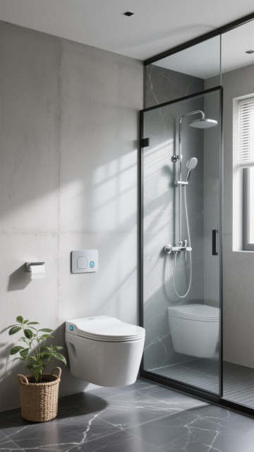 极简主义风格的卫生间室内设计,整体采用米白色与浅木色的柔和配色方案,温暖的嵌入式灯带与顶部筒灯提供均匀柔和的照明,营造明亮通透的氛围。墙面和地面铺设大块浅色哑光瓷砖,线条简洁流畅。不同场景下的卫生间摆设:有的配备悬挂式白色洗手台,台面整洁,搭配简约白色水龙头,上方是带储物功能的镜柜,旁边装有黑色金属毛巾架;有的设置独立玻璃淋浴房,内部有壁龛收纳洗浴用品,黑色淋浴喷头与五金件形成精致对比;有的墙面悬挂线条简约的黑白花卉装饰画,下方嵌入木质灯带壁龛,摆放香薰和装饰摆件;有的空间内放置智能马桶,旁边设有带木质搁板的收纳区。整体设计注重功能性与美学的平衡,空间布局合理,细节处理精致,呈现出现代、干净、舒适的卫生间环境。