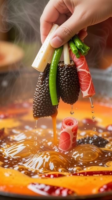 高角度俯拍的沸腾火锅特写,浓郁的红色汤底翻滚冒泡,蒸汽氤氲缭绕,一双筷子正夹起一块鲜嫩的肉片悬于锅上方,周围环绕着多盘各色新鲜食材如蔬菜、丸子、菌菇等,整体画面采用深色背景突出食物色彩,光影对比强烈,聚焦清晰,营造出热气腾腾、诱人食欲的餐饮氛围,具有专业美食摄影的质感和细节。