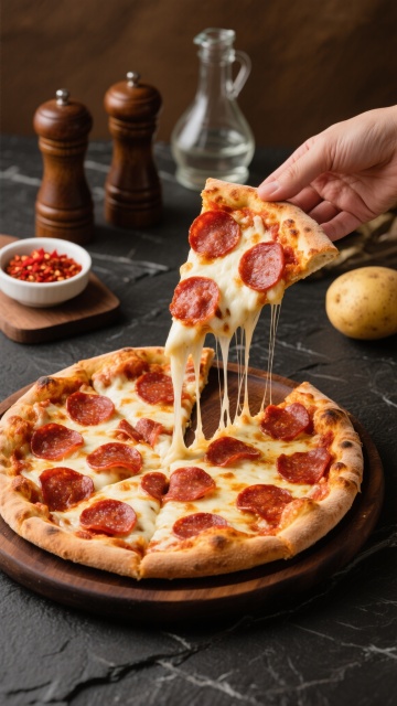超写实美食摄影风格,特写镜头下的双层芝士培根汉堡,顶部是撒有黑芝麻的金黄色芝麻面包,面包边缘微焦,夹着两片厚实多汁的煎制牛肉饼,肉饼表面有诱人的焦香纹理,融化的黄色芝士从肉饼边缘溢出,上层覆盖几片酥脆的深红色培根,培根边缘微卷,中间夹着紫红色洋葱圈,下层铺着新鲜翠绿的生菜叶和几片鲜红的厚切番茄片,底部是同样的芝麻面包,整个汉堡放置在棕色烘焙纸上,纸张铺在深色木质圆形托盘上,托盘边缘可见自然木纹,汉堡左侧有一把银色金属叉子和刀子交叉摆放,背景略微虚化,左侧后方有一个金属容器,里面装满金黄色的炸薯条,薯条表面撒有细盐,容器内衬浅色油纸,右上角有一个棕色纸质包装袋,整体画面采用侧上方单光源,光线柔和,在汉堡上形成明显的高光和阴影对比,突出食材的质感和立体感,色调温暖,以棕色、金黄色、红色为主,营造出浓郁诱人的美式快餐氛围,背景为深色,突出主体食物,无文字和二维码。