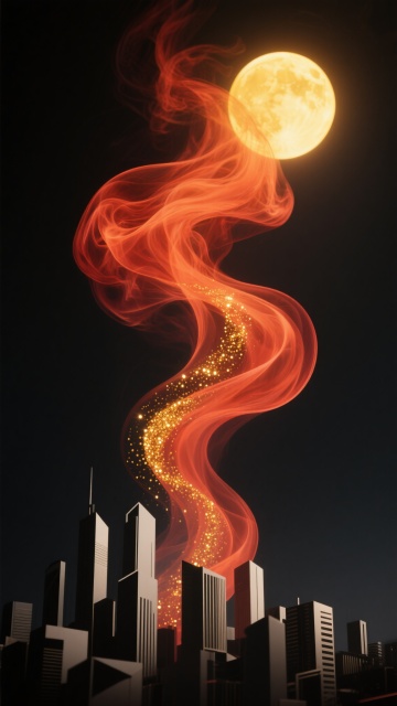 抽象艺术风格,以城市建筑轮廓为基底,融合流动飘逸的烟雾元素,烟雾呈现渐变的橙红色调,带有金属光泽质感,纹理细腻且富有层次感,背景为深邃的暗红色,整体光影对比强烈,烟雾的动态感十足,仿佛在城市上空舞动,营造出神秘而富有艺术气息的氛围,画面简洁而富有视觉冲击力,突出城市与烟雾的艺术融合效果。
