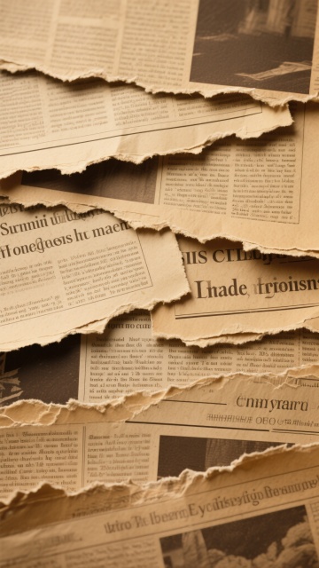 一组六个不同配色、不同造型的复古报纸素材集合,每个素材都具有手工拼贴风格,报纸呈现出撕裂边缘、褶皱质感和复古印刷纹理,背景为纯色(分别为米白、浅灰、淡棕、浅蓝、淡绿、浅黄),素材整体色彩统一且柔和,规整地排列在画面中,保持了旧报纸的怀旧氛围和层次感,每个素材的报纸排版和造型略有变化,形成丰富而协调的视觉效果。