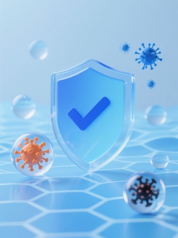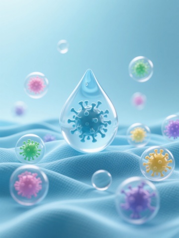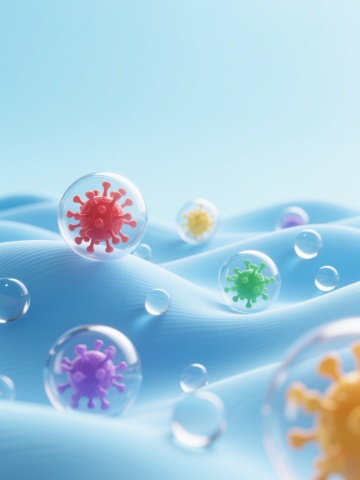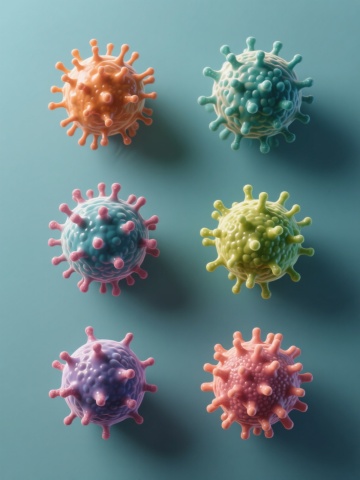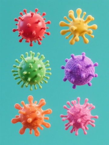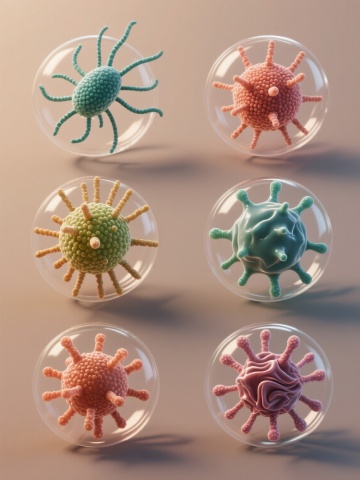6个不同配色、不同品种、不同造型的细菌素材集合,每个细菌都具有3D写实风格,表面有细腻的纹理和凸起,周围环绕着透明的、带有轻微光泽和折射效果的圆形透明包膜,整体采用纯色背景,细菌们被规整地排布在画面中,保持统一的光照效果,每个细菌都有独特的色彩搭配和形态特征,有的呈球形带有多个突起,有的呈杆状带有鞭毛,有的则具有复杂的多面体结构,整体画面清晰、科学、具有高度的细节表现力。