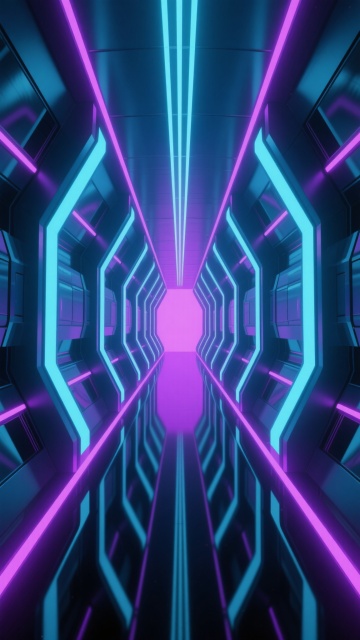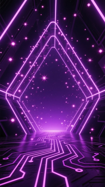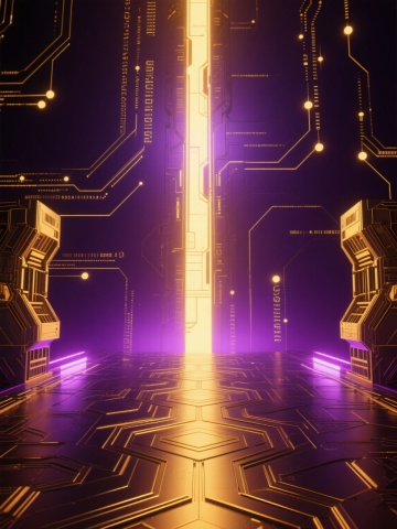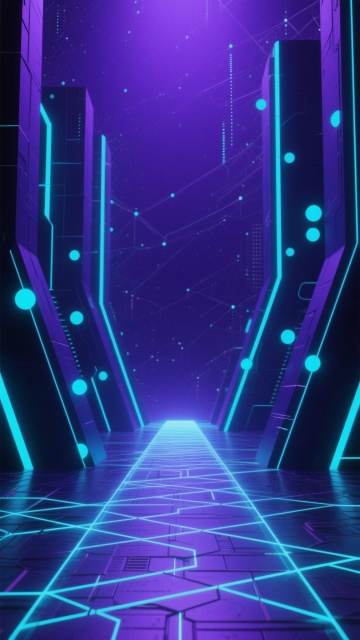 一张未来科技感十足的3D渲染场景,整体采用深邃的紫色调为基底,搭配明亮的青色作为主要发光元素,营造出神秘而前沿的氛围。画面中央是一条向前延伸的发光能量通道,地面由复杂交错的几何线条构成,线条呈现出明亮的青色光泽,并有规律地排列形成科技感十足的地面纹理。通道两侧是高耸的抽象科技结构,由垂直和倾斜的线条组成,线条边缘发出柔和的青色光芒,结构上点缀着大小不一的发光圆点,如同数据流动的节点。背景是深邃的紫色空间,布满了细小的发光点和线条,模拟出浩瀚的数字宇宙或网络空间的景象。整个场景光影对比强烈,底部通道光线最为明亮集中,向上逐渐变暗,形成自然的景深效果。线条和发光元素边缘清晰锐利,呈现出高精度的3D渲染质感,整体构图采用对称式布局,视觉焦点集中在通道的尽头,引导观者视线向前延伸,传达出探索、进步和未来感的核心主题。