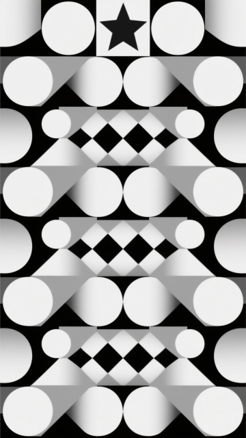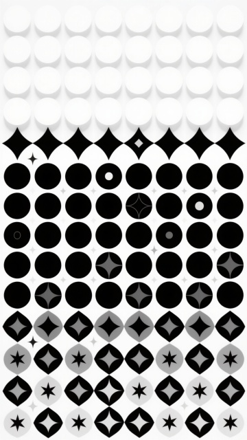 极简主义风格几何图案,白色背景,由大小不一的白色圆形和黑色菱形以渐变密度排列组成,底部圆形较大且密集,向上逐渐变小并稀疏过渡,整体呈现对称、规律的抽象装饰美感,线条清晰锐利,黑白对比鲜明,无任何文字和额外元素。