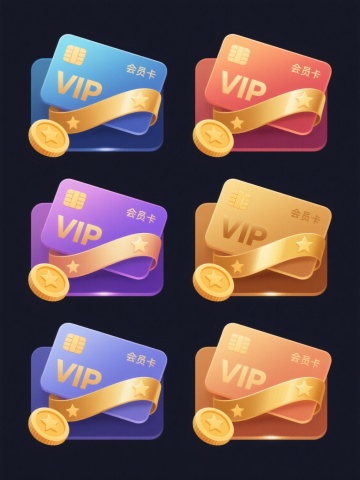 纯色背景上,四个具有相同软3D风格的图标呈规整排布,每个图标拥有独特的整体色彩,分别是闪耀的金色购物车、明亮的蓝色信用卡、炫目的紫色礼盒和鲜艳的红色奖章,所有图标均具有光滑的表面、圆润的边角、清晰的高光和柔和的阴影,保持与VIP字母相同的立体感和材质表现,整体设计简洁现代,视觉层次分明,信息传达高效。
