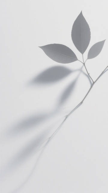 极简主义风格的白色背景,柔和的光线从左上角斜射而下,在浅灰色的墙面和白色的台面上投下飘逸的植物叶片投影,投影边缘模糊柔和,呈现出自然的光影层次感,整体画面干净、通透,营造出宁静、简约的氛围,保持投影风格样式。