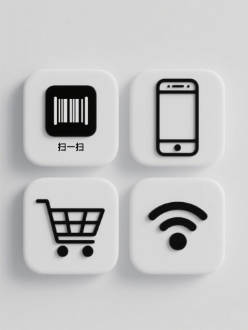 软3D风格设计,一组四个规整排布的极简风格图标,整体采用非白色的单一纯色背景,每个图标元素清晰可辨,保持高度视觉简洁度和识别性,四个图标在画面中均匀分布,形成协调的系列素材集合。第一个图标为"扫码"图标,包含黑色的方形扫描框和内部条形码图案,下方有"扫一扫"文字;第二个图标为"手机"图标,采用相同粗细的线条勾勒出智能手机的轮廓,屏幕区域为纯色填充;第三个图标为"购物车"图标,以粗线条绘制出经典的购物车造型,包含车轮和车筐;第四个图标为"网络"图标,使用线条描绘Wi-Fi信号图案。图标设计具有清晰的视觉层级,元素排布均衡,线条粗细一致,整体呈现出简洁现代的设计感,信息传达高效直观,图标边缘有轻微的3D立体阴影效果,增强层次感,背景颜色统一柔和,与黑色图标形成鲜明对比,提升整体视觉舒适度和专业感。