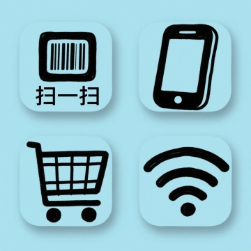 手绘插画风格设计,一组四个规整排布的极简风格图标,整体采用淡蓝色单一纯色背景,每个图标元素清晰可辨,保持高度视觉简洁度和识别性,四个图标在画面中呈2x2网格均匀分布,形成协调的系列素材集合。第一个图标为"扫码"图标,包含黑色的方形扫描框和内部条形码图案,下方有"扫一扫"文字;第二个图标为"手机"图标,采用相同粗细的线条勾勒出智能手机的轮廓,屏幕区域为纯色填充;第三个图标为"购物车"图标,以粗线条绘制出经典的购物车造型,包含车轮和车筐;第四个图标为"网络"图标,使用线条描绘Wi-Fi信号图案。图标设计具有清晰的视觉层级,元素排布均衡,线条粗细一致,整体呈现出简洁现代的设计感,信息传达高效直观,图标边缘有轻微的3D立体阴影效果,增强层次感,背景颜色统一柔和,与黑色图标形成鲜明对比,提升整体视觉舒适度和专业感。