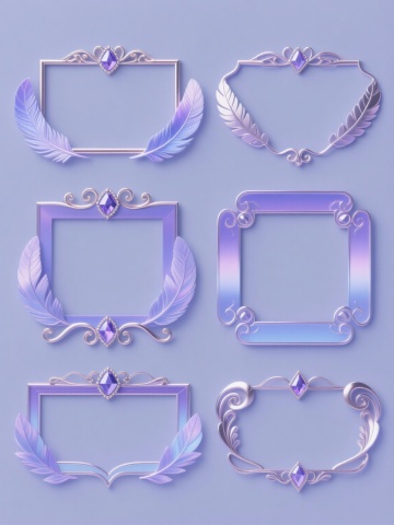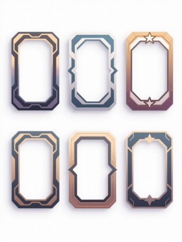 六个卡牌边框,白色背景,排列整齐,每个边框具有不同配色、不同样式和不同材质。边框设计风格为数字艺术风格,线条平滑,边缘清晰,带有精致的几何装饰图案,如星形、折线等。第一个边框为金色金属材质,带有光泽感和细微的纹理;第二个边框为深蓝色宝石材质,呈现出透明感和内部折射效果;第三个边框为暗红色木质材质,带有木纹细节和复古感;第四个边框为浅绿色玉石材质,表面光滑,带有柔和的反光;第五个边框为紫色水晶材质,边缘锐利,具有多面切割的效果;第六个边框为银色磨砂金属材质,带有细腻的磨砂质感和哑光效果。每个边框都有独特的几何装饰元素,整体视觉风格统一,细节丰富,色彩和谐,构图平衡,具有清晰的视觉层次。