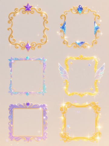六个不同配色、不同样式的头像边框素材,整体采用华丽梦幻的卡通风格,每个边框均融入水晶、星星、翅膀、卷曲花纹等元素,色彩分别为紫金色、蓝粉色、绿金色、橙银色、红金色、青紫色,均具有通透的宝石质感、细腻的高光反光和柔和的光晕效果,以浅色为统一背景,上下两行各三个整齐对齐排列,构图均衡,细节精致,充满魔法与童话气息。
