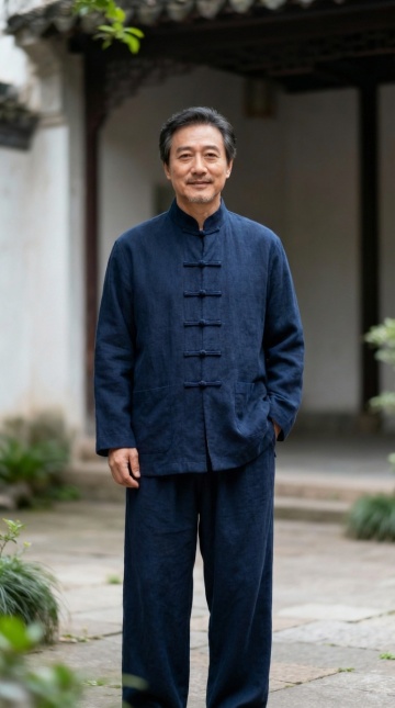 写实风格摄影,画面整体采用柔和的靛蓝色与暖橙色对比色调,一位约四十岁左右的中年男子,身着象牙白传统中式长衫,正专注地在古朴的木质茶桌前进行茶道仪式,他手持茶勺,神情沉静而专注,眼神温和。背景是深色木质博古架,上面整齐摆放着多个靛蓝色与橙色渐变的陶瓷茶罐,左侧悬挂着一盏散发暖橙色光芒的中式纸灯笼,灯笼上有模糊的书法文字。茶桌上摆放着靛蓝色的茶碗、深色陶制茶炉、茶则、茶针等茶道器具,还有一本打开的线装古籍。整体光影柔和,侧逆光勾勒出人物的轮廓,营造出宁静、典雅而略带现代感的氛围,画面构图遵循三分法,人物位于右侧黄金分割点,前景茶具清晰,背景书架稍显虚化,形成自然的景深效果,色彩和谐统一,细节丰富,质感细腻,展现出传统茶道文化的韵味与中年男子沉稳内敛的气质。