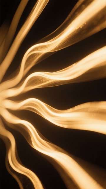 金色光芒以波浪状流动形态从画面中心向四周扩散,光线呈现出丝绸般的光滑质感和柔和的渐变过渡,背景为纯黑色,整体营造出神秘而华丽的氛围,光芒的亮度从中心向边缘逐渐减弱,形成自然的光影层次,光线之间相互交织,呈现出有机的曲线形态,给人一种流动和动态的视觉感受。