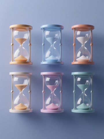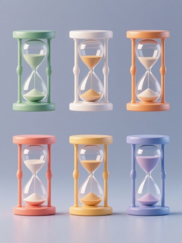 一系列不同造型的3D立体时钟元素组合,保持圆润可爱的卡通风格,采用柔和渐变的新配色,每个时钟具有独特设计细节,整体规整排列在纯色背景上,带有环绕的半透明光环和点缀的几何装饰图形,光影柔和,保持简洁明快的视觉效果和清晰的图形层级。