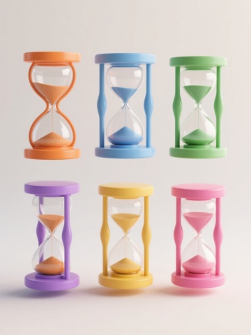一套6张的3D风格系列素材集合,每张素材均为规整排布的单一闹钟图案,闹钟整体造型简约现代,采用纯色背景,无任何文字、logo和水印。第一张:红色渐变外壳的双铃闹钟,金色金属装饰,表盘中央有红色闪电图案,表盘为米黄色,金色刻度和指针,金色支架。第二张:蓝色渐变外壳的圆形闹钟,银色金属边框,表盘为白色,黑色数字和指针,顶部有一个银色提手。第三张:绿色磨砂质感的方形闹钟,黑色数字和指针,表盘为浅绿色,四个角有银色金属包边,底部有四个黑色防滑垫。第四张:黄色光滑外壳的卡通闹钟,造型像一个小房子,红色屋顶,白色表盘,黑色数字和指针,门口有一个小台阶。第五张:紫色透明外壳的球形闹钟,内部有蓝色LED灯,表盘为黑色,白色数字和指针,顶部有一个银色按钮。第六张:粉色软胶材质的椭圆形闹钟,表盘为浅粉色,金色数字和指针,顶部有两个粉色的小耳朵,底部有两个粉色的小脚丫。