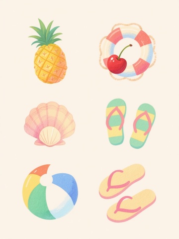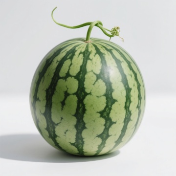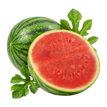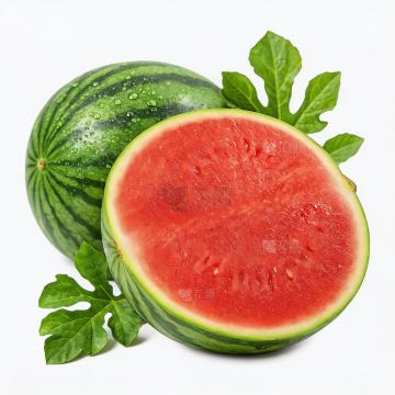水彩风格插画,六个不同样式的西瓜以上下两行三列对齐排列,浅色背景。每个西瓜造型各异:完整带藤绿皮西瓜、切片露出红瓤黑籽西瓜、半圆剖面西瓜、带叶小西瓜、条纹图案西瓜、圆点装饰西瓜。西瓜色彩清新明快,绿色瓜皮带有自然纹理和水彩晕染效果,红色瓜瓤饱满多汁,点缀黑色西瓜籽。每个西瓜搭配几片绿色西瓜叶,叶片边缘有自然的水彩笔触和透明感。整体构图简洁平衡,符合水彩画的透明质感、柔和色彩过渡和细腻笔触特征,无文字和其他装饰元素。