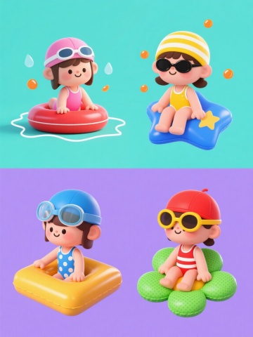 四个不同风格、不同造型的游泳系列素材集合,规整排布。第一个:扁平化风格,纯色背景为浅蓝色,小女孩穿着粉色连体泳衣,戴着粉色泳帽和白色泳镜,趴在红色圆形游泳圈上,周围有白色波浪线条和水滴图案,造型简洁,色彩明快。第二个:手绘卡通风格,纯色背景为浅绿色,小女孩穿着黄色分体泳衣,戴着黄色条纹泳帽和黑色泳镜,坐在蓝色星形游泳圈上,表情俏皮,周围有橙色小气泡,线条流畅,充满童趣。第三个:3D立体风格,纯色背景为橙色,小女孩穿着蓝色带白色波点的泳衣,戴着蓝色泳帽和透明泳镜,趴在黄色方形游泳圈上,游泳圈有立体感,小女孩身上有光影效果,显得生动逼真。第四个:复古漫画风格,纯色背景为紫色,小女孩穿着红色带白色条纹的泳衣,戴着红色泳帽和黄色泳镜,坐在绿色花朵形状的游泳圈上,画面有复古的网点效果,线条粗犷,色彩对比强烈。