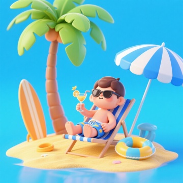 一系列4个不同内容的3D卡通风格儿童夏日活动插画,保持低多边形圆润造型、明亮柔和光影、高饱和度色彩和光滑材质质感,每个元素独立置于纯色背景上并规整排布;第一个画面:穿着黄色条纹上衣和蓝色短裤的男孩戴着橙色泳镜,躺在蓝白相间的游泳圈上开怀大笑,双手举起泳镜,双腿自然伸直;第二个画面:穿着粉色连衣裙的小女孩戴着粉色蝴蝶结发箍,坐在黄色充气鸭子游泳圈里,手里拿着一个红色草莓冰淇淋,面带微笑看向一侧;第三个画面:穿着绿色短袖和白色沙滩裤的小男孩戴着蓝色太阳帽,站在紫色冲浪板旁,手里拿着黄色沙滩铲,脚下踩着白色沙滩,表情兴奋;第四个画面:穿着橙色泳衣的小女孩戴着紫色浮袖,坐在粉色充气独角兽游泳圈上,手里拿着一个黄色小水桶,水面上漂浮着蓝色小鸭子玩具,笑容灿烂。