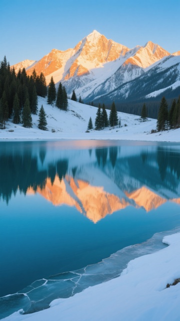 广角俯拍视角,晨曦微露时分,一片被晨雾轻轻笼罩的山谷湖泊全景。远处层叠的青灰色山脉峰顶覆盖着昨夜新降的皑皑白雪,山腰处云海如丝绸般缠绕流动。湖岸线蜿蜒曲折,一侧是橙红与金黄交织的茂密枫林,另一侧是深绿色的松树林,色彩对比鲜明而和谐。湖面如巨大的黑曜石镜面,精准倒映着渐变的天空——从东方鱼肚白过渡到淡粉、浅紫,再到远处的靛蓝。湖边长满沾着露珠的翠绿苔藓,几株红色浆果灌木点缀其间,几片枫叶轻轻漂浮在近岸水面。光线柔和而富有方向性,晨雾在阳光穿透下形成金色光柱,空气中悬浮着细小的水汽颗粒。构图遵循黄金分割,前景的岩石、中景的湖岸与远景的山脉形成完美的视觉引导线,景深从近岸的露珠到远山的积雪都保持清晰锐利,整体氛围既静谧神圣又充满苏醒的生命力。