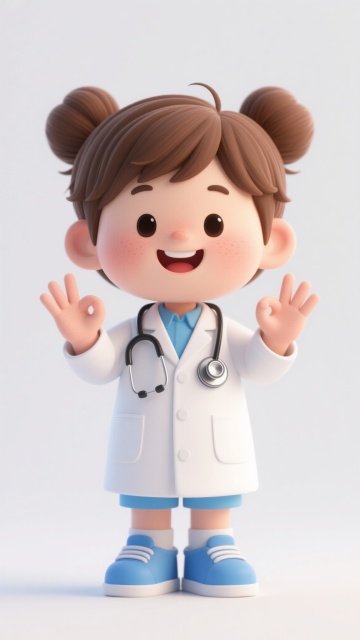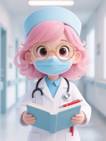 1. 特写镜头,一位穿着天蓝色护士服的小女孩,粉色长卷发在脑后扎成俏皮的丸子头,白色护士帽上别着小熊图案的发夹,大大的蓝色眼睛闪烁着温柔的光芒,嘴角挂着治愈的微笑,左手抱着一只戴着迷你听诊器的棕色小仓鼠玩偶,右手拿着一个粉色的注射器造型棒棒糖,周围漂浮着心形药片和星星图案的体温计,白色背景凸显主体。